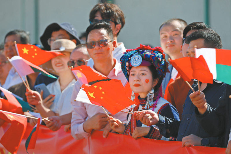 4月10日,中国海军第45批护航编队抵达马达加斯加进行友好访问,欢迎人群挥动两国国旗欢迎编队到访。中国海军第45批护航编队10日抵达马达加斯加图阿马西纳港,开始为期5天的友好访问。 新华社发 王远方 摄