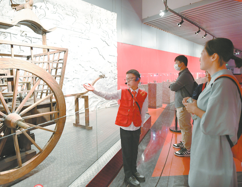 5月2日,在北京汽车博物馆,“小小讲解员”(左一)为游客介绍展品。“五一”假期,文旅市场火热。新华社记者 任超 摄