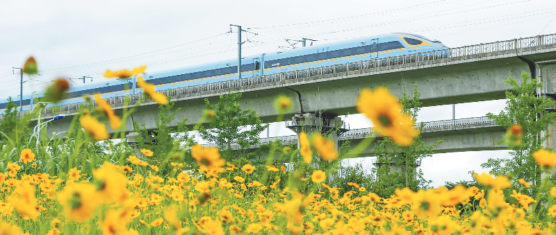 5月5日,一辆列车从安徽省黄山市徽州区西溪南镇的金鸡菊花海旁经过。“五一”假期,各地秀丽的风光和多彩的活动吸引游人纷至沓来。 新华社发 施亚磊 摄