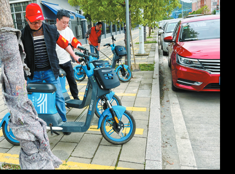 近日,长汀公路中心组织志愿者,深入社区开展文明实践主题活动,引导大家从我做起、从小事做起,用实际行动传播文明行为、倡导文明新风,为营造干净、整洁、文明、和谐的城市环境贡献一份力量。图为志愿者将共享电动车摆放整齐。融媒体记者 罗玉文 通讯员 孔锦华 摄