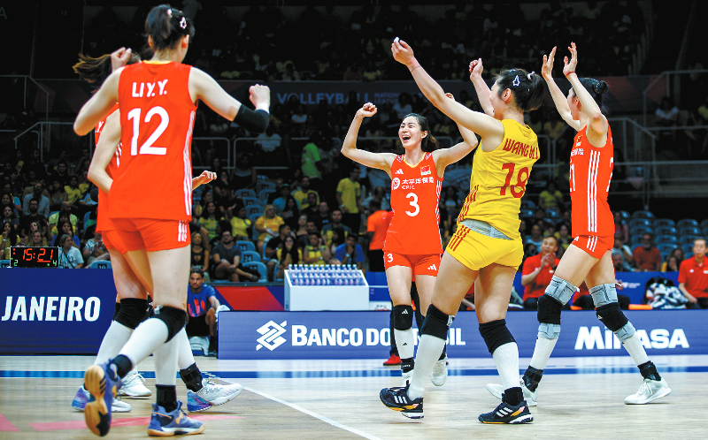 5月14日,中国队球员庆祝胜利。当日,在2024世界女排联赛里约热内卢站比赛中,中国队3比0战胜韩国队。新华社发 克劳迪娅·马尔提尼 摄