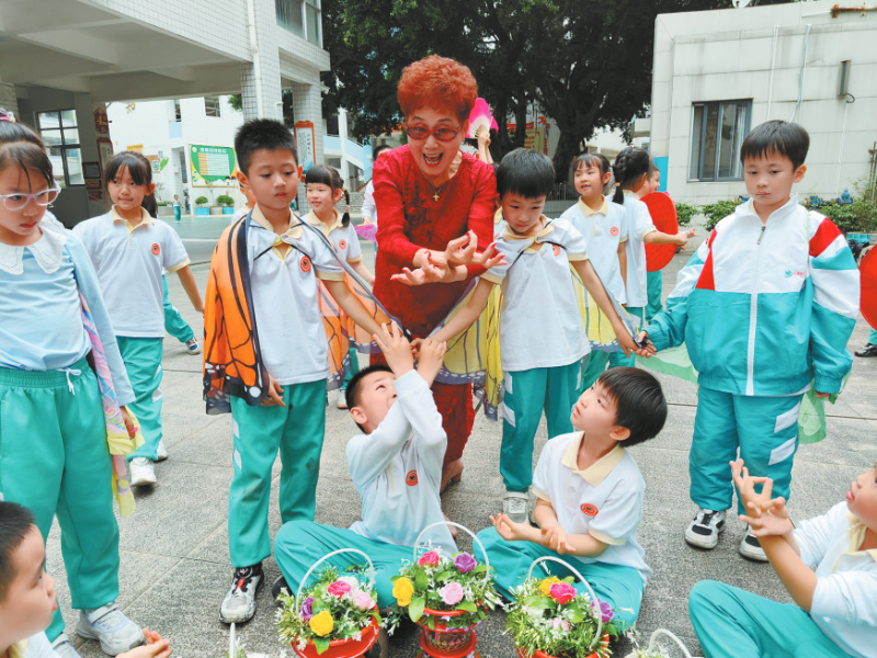 近日,80岁的“山歌奶奶”——龙岩山歌艺术家协会主席郭金香深入龙岩市实验小学,开展唱山歌、采茶灯等非遗文化传承宣传活动。现场,郭金香以委婉动听的歌声唱出了山歌的魅力,让人感受非遗文化的魅力,同学们在快乐轻松、新奇有趣的氛围下,享受了一场家乡味十足的“文化大餐”。据了解,郭金香致力文化传承60余载,为弘扬龙岩山歌、采茶灯等龙岩非物质文化遗产,她经常自带采茶灯教具,走进高校、中小学校、幼儿园现场教学,每年开展山歌表演活动上百场,观众达几十万人次。图为郭金香正在为同学们教授采茶灯舞蹈动作。 通讯员 刘丽凌 万露 摄