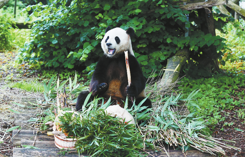 6月2日,在比利时布吕热莱特的天堂动物园,大熊猫“天宝”在享用“生日大餐”。当日,比利时天堂动物园为大熊猫“天宝”举行八岁生日庆祝活动。2016年6月,中国旅比大熊猫“好好”产下雄性幼仔“天宝”,“天宝”成为首只在比利时出生的大熊猫。 新华社记者 赵丁喆 摄