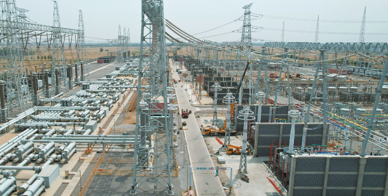 6月4日,工人在位于河北省新河县境内的榆横至潍坊1000千伏特高压交流输变电工程邢台变电站扩容工程建设工地施工(无人机照片)。该变电站扩容工程新增2组3000兆伏安变压器等设备,目前项目建设正稳步推进。据介绍,陕西榆横至山东潍坊1000千伏特高压交流输变电工程邢台变电站是京津冀鲁负荷中心的重要枢纽。扩容工程竣工投产后将有效提升送电能力、保障电网安全。新华社记者 杨世尧 摄