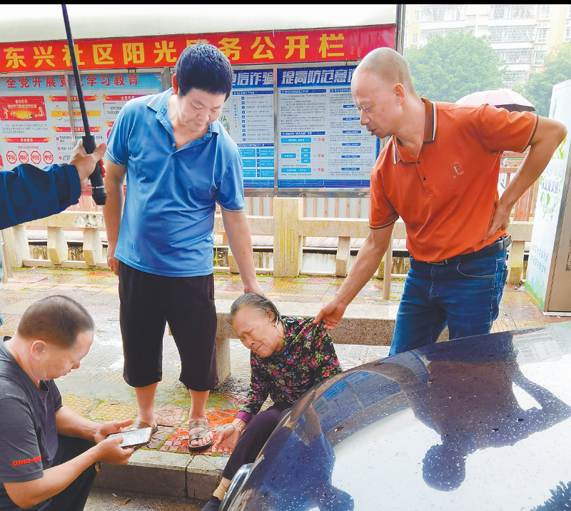当天,郑永煌(左一)把老人从河岸上抬到路面栈道后,蹲在地上拿着手机拨打120求救。
