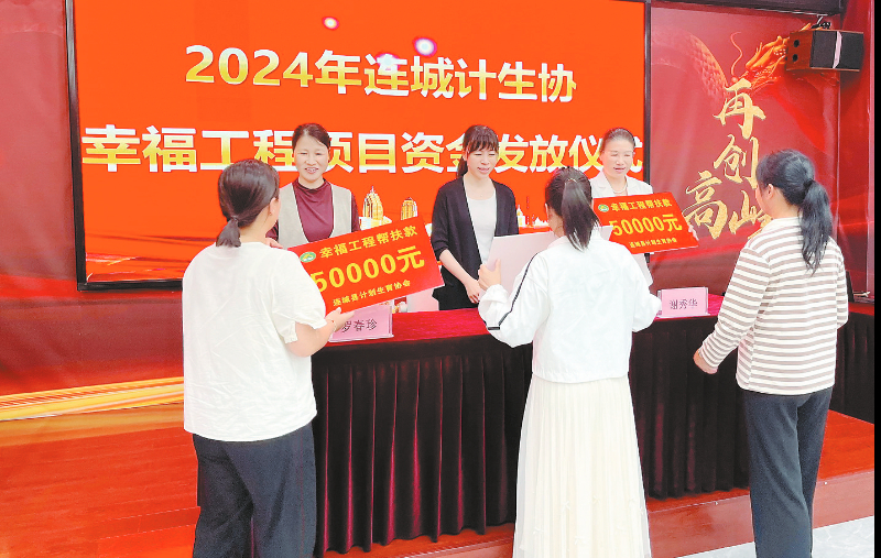 近日,连城县计生协会举行幸福工程项目资金发放仪式,共有3个乡镇5户“幸福工程”项目户获得帮扶,每户帮扶款5万元,共发放“幸福工程”帮扶款25万元,支持3户种植户、1户养殖户、1户商业户发展生产经营,助力项目户生产增效,经济增收。