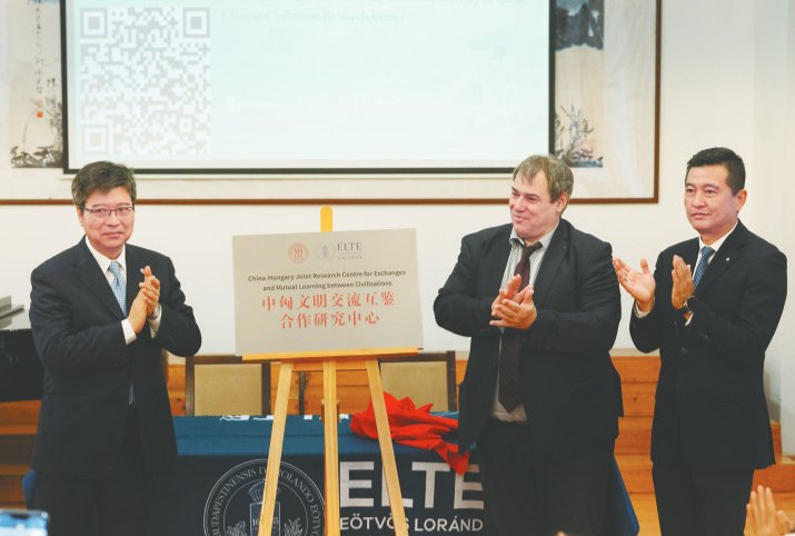 6月10日,在匈牙利布达佩斯举行匈牙利罗兰大学—中国人民大学“中匈文明交流互鉴合作研究中心”揭牌仪式,中国人民大学校长林尚立(左一)和匈牙利罗兰大学副校长伊姆雷·豪毛尔(中文名郝清新)(左二)为中匈文明交流互鉴合作研究中心揭牌。 新华社发 弗尔季·奥蒂洛 摄