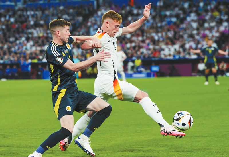6月14日,德国队球员基米希(右)在比赛中拼抢。当日,在德国慕尼黑进行的2024年欧洲足球锦标赛小组赛A组首轮比赛中,东道主德国队5比1战胜苏格兰队。