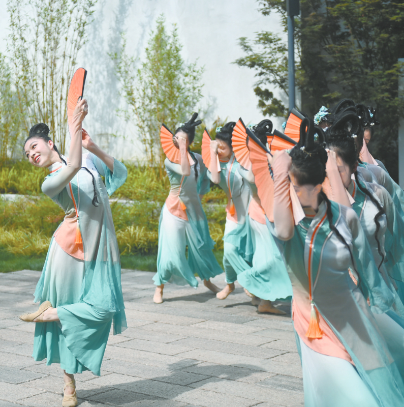 6月16日,北京舞蹈学院学生在资华筠舞蹈艺术馆外表演舞蹈《醉春风》。当日,坐落于浙江省湖州市德清县新市古镇的资华筠舞蹈艺术馆举行开馆仪式。资华筠是新中国第一代舞蹈表演艺术家、舞蹈理论家和舞蹈教育家,她是《飞天》双人舞中的表演者,被舞蹈界称作“飞天女神”。新华社记者 黄宗治 摄