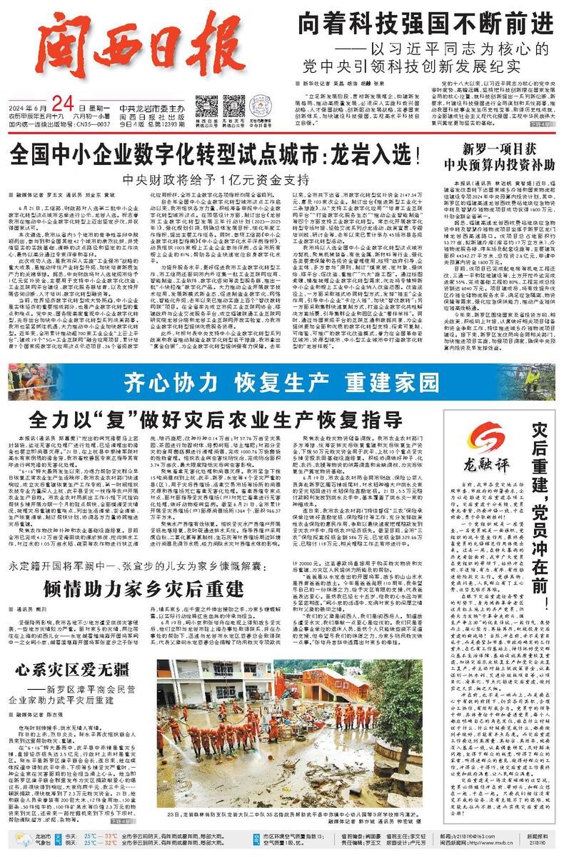 “6·16”特大暴雨发生以来,为竭力帮助受灾群众早日恢复正常农业生产生活秩序,我市农业农村部门快速响应,成立灾后重建恢复生产工作专班,第一时间组织农技专业力量深入上杭、武平县受灾一线指导农户开展农业生产自救。市农业农村局派出工作小组下沉挂钩帮扶乡镇开展为期一个月的驻点帮扶,全面摸清受灾情况,梳理灾后重建的重难点,列出生活清单、安全清单、生产恢复清单,制订帮扶计划,协调各方力量协同推进灾后重建。