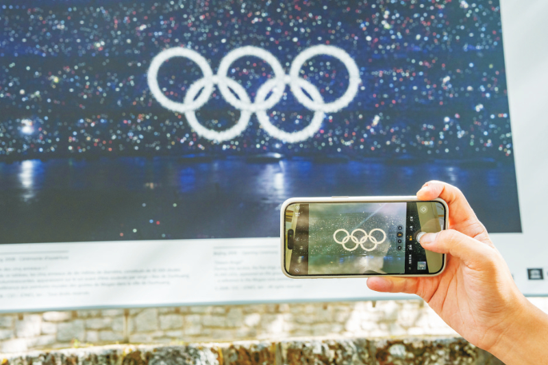 7月6日,一名参观者用手机拍摄联合国教科文组织展出的北京奥运会开幕式照片。随着2024年巴黎奥运会开幕临近,位于巴黎市中心的杜乐丽花园、货币博物馆、联合国教科文组织等地举办了多个奥运主题展览,介绍奥林匹克历史和文化。 新华社记者 许畅 摄