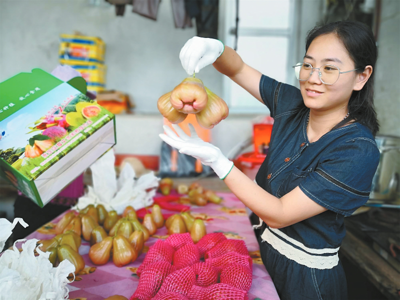河头莲雾远销全国各地,图为员工正将采摘的新鲜莲雾装箱。