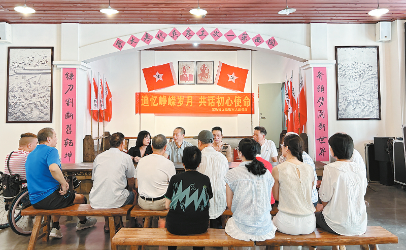 为进一步做好拥军优属工作,在“八一”建军节来临之际,新罗区东街社区退役军人服务站组织开展“追忆峥嵘岁月 共话初心使命”庆“八一”主题活动。图为辖区代表坐在一起分享自己的军旅生涯和工作经历。通讯员 谢小娜 摄