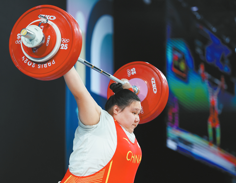 8月11日,中国选手李雯雯在比赛中。当日,在巴黎奥运会举重项目女子81公斤以上级比赛中,中国选手李雯雯夺得金牌。新华社记者 杨磊 摄