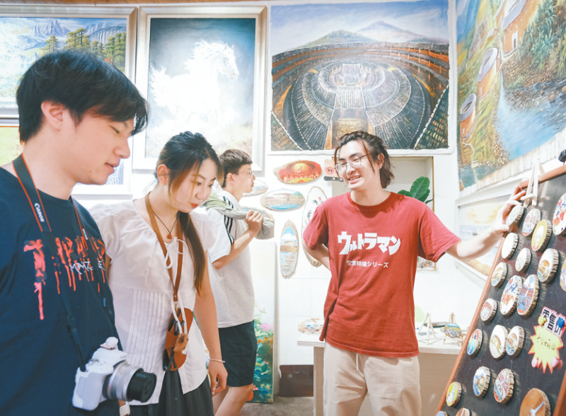 暑假期间,永定土楼成为旅游热门地,景区方面积极引导游客文明参观,土楼吹起文明旅游风。图为游客正在挑选纪念品。