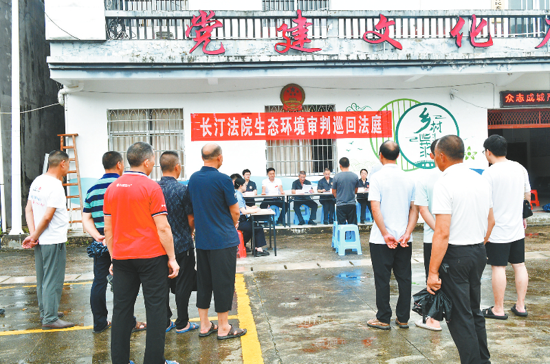 一江绿水映疏影,数树蝉鸣声阵阵。近日,长汀县人民法院行政生态庭将庭审现场搬到长汀县庵杰乡“汀江源头”涵前村,由两名审判员与一名生态专家陪审员组成合议庭,巡回审理了一起非法猎捕、出售陆生野生动物案。