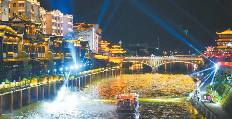 近日,长汀县“来了就是客”古韵汀州·消暑奇妙夜活动持续火热。夜幕降临时,济川门、水东街、店头街、卧龙书院等知名景点吸引众多游客前来打卡。自8月起,每周五、六、日晚七点半至十点,消暑奇妙夜活动精彩上演。据悉,今年以来,长汀县旅游人数再创历史新高,2024年上半年共接待游客466.01万人次,同比增长17.8%。图为夜游汀江。