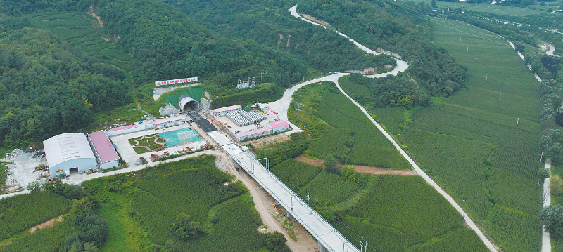 这是西延高铁武家塬隧道出口(8月25日摄,无人机照片)。当日,由中铁三局承建的西(安)延(安)高铁武家塬隧道顺利贯通。武家塬隧道位于陕西省铜川市宜君县,全长约9.7千米。西安至延安高速铁路是陕北革命老区的首条高铁,也是国家高速铁路网包(银)海高速铁路通道的重要组成部分,建成投入运营后,西安至延安的铁路运行时间将从目前的2.5小时缩短至1小时左右。新华社记者 张博文 摄
