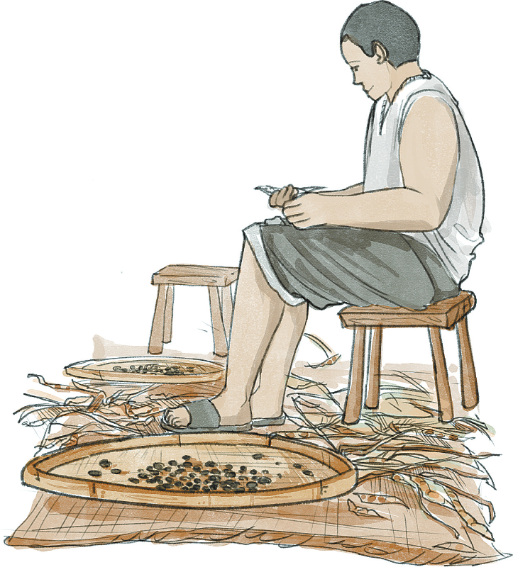 黑豆可是广种薄收的作物。端午节前种下去,历经炙阳烈雨,至秋季稻子黄熟时方有收成。带上挑杆、篾条和镰刀,砍下豆苗,绑两大捆挑回,摊在晒谷坪里晾晒。