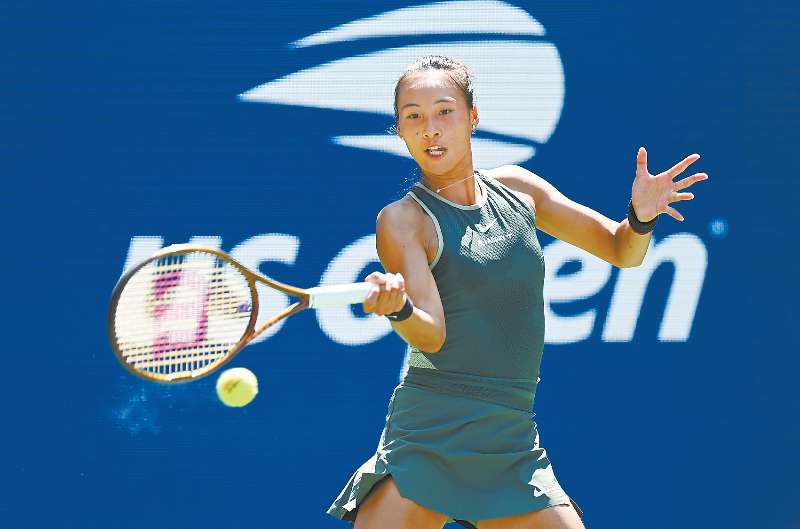 8月26日,郑钦文在比赛中回球。当日,在2024美国网球公开赛女子单打首轮比赛中,中国选手郑钦文2比1战胜美国选手阿尼西莫娃,晋级第二轮。 新华社记者 李睿 摄