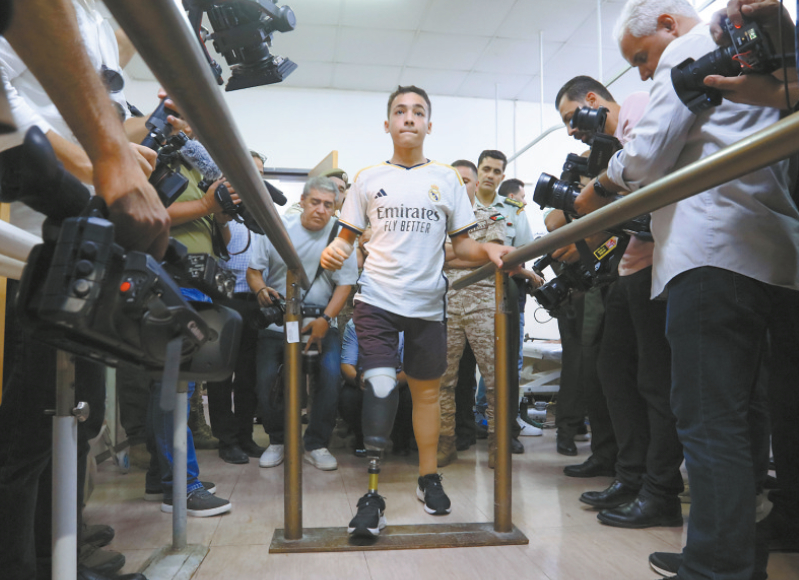 8月26日,在约旦首都安曼侯赛因医学城,一名在巴以冲突中失去一条手臂和双腿的男孩安上假肢后练习走路。约旦26日启动一项为加沙地带的截肢者安装假肢计划,以帮助在巴以冲突中受伤的截肢者。新华社发(穆罕默德·阿布·古什摄)