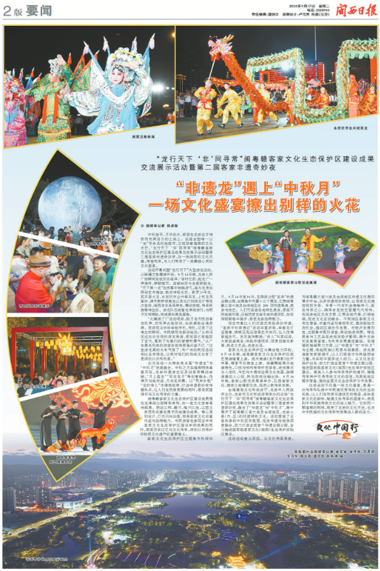 由福建省文化和旅游厅、龙岩市人民政府主办,龙岩市文化和旅游局承办的这场“龙行天下‘非’同寻常”闽粤赣客家文化生态保护区建设成果交流展示活动暨第二届客家非遗奇妙夜,融合了“非遗龙”与“中秋月”,集中展示了闽粤赣三省六地及台湾地区,龙岩七县(市、区)的非遗特色文化。活动营造了主客共享的中秋狂欢氛围,促进非遗与旅游深度融合,助力打造全国首个非遗主题公园,全力推进国家级客家文化(闽西)生态保护实验区建设。