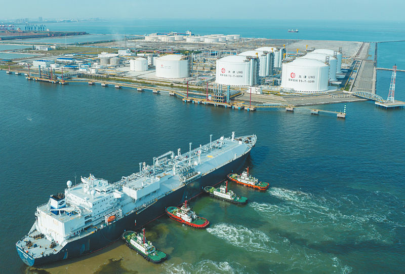 9月26日,来自澳大利亚的“希瑟莎莉”号LNG船在国家 管 网 天 津LNG接收站码头靠泊(无人机照片)。这是天津LNG二期项目投产后接卸的“首船”。新华社发 杜鹏辉 摄