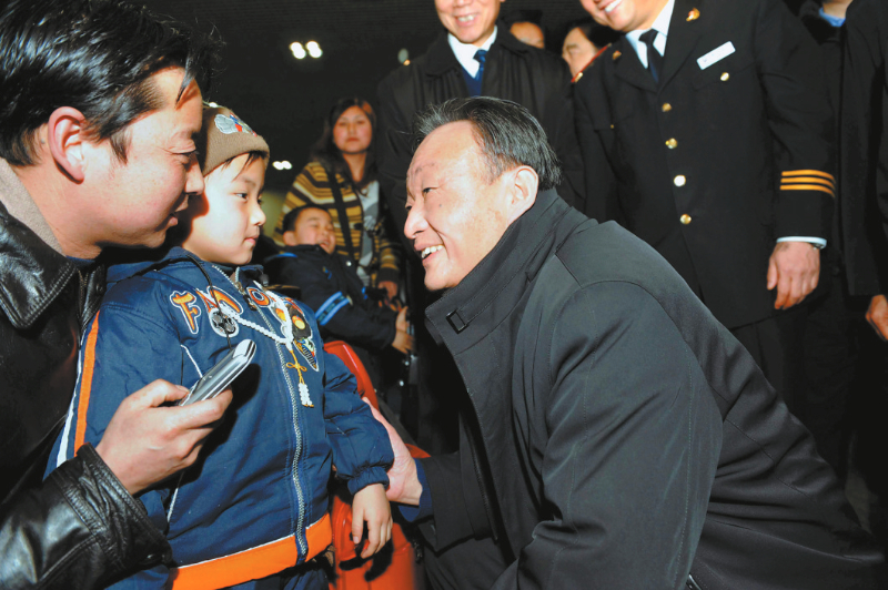 2008年2月3日,吴邦国同志在北京西站候车室与旅客交谈。新华社记者 李涛 摄