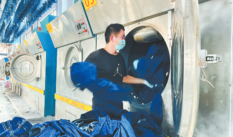 图为益丰制衣厂工人正在洗涤牛仔裤。
