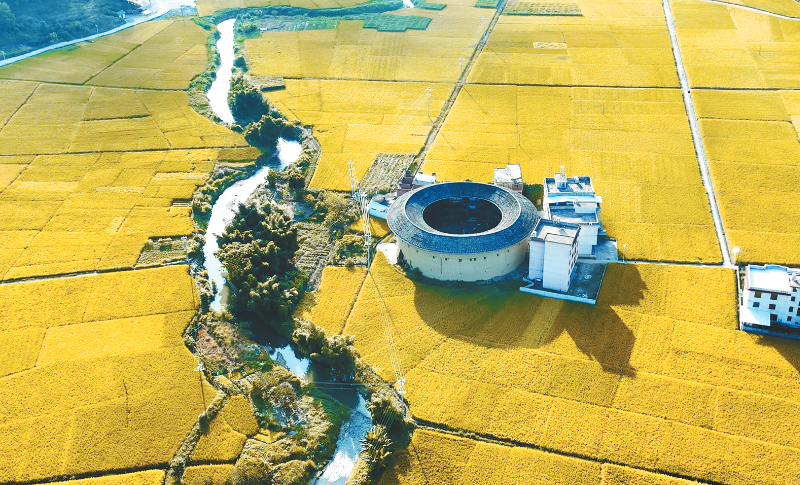 眼下正是稻谷成熟的季节,在永定区湖坑镇的奥杳村,稻谷在阳光的照耀下金光灿灿,宛如一片金色的海洋。金色的稻浪中,一座古朴的圆形土楼静静地矗立在稻田中央,与四周的稻香、秋风交织成一首无言的田园牧歌,土楼旁,一条清澈见底的小河潺潺流过,添上了几分灵动与和谐,仿佛是大自然最精致的笔触。此刻的奥杳村,仿佛被金色的画笔轻轻勾勒,每一笔都蕴含着丰收的喜悦与对美好生活的向往。 通讯员 熊川 摄