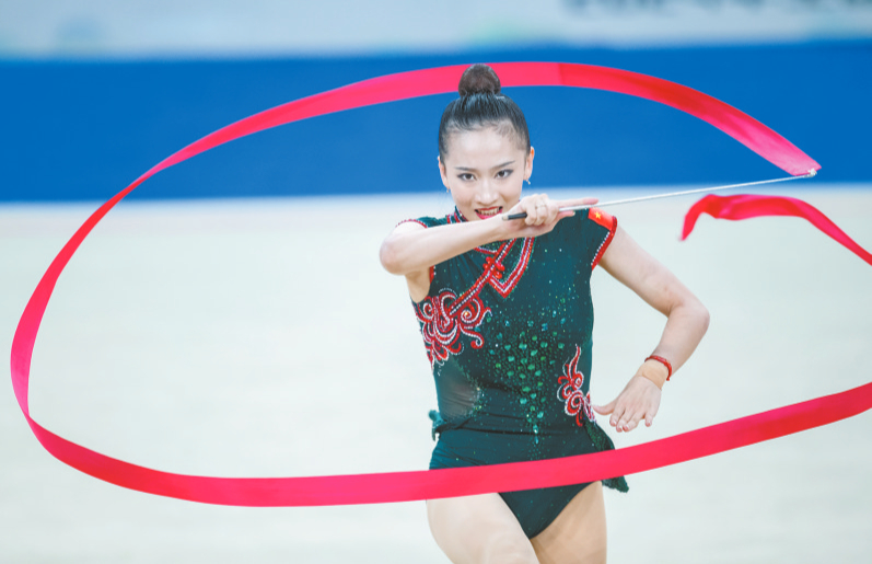 10月21日,陕西队选手王子露在比赛中。当日,在重庆举行的2024年全国艺术体操冠军赛成年个人全能决赛中,陕西队选手王子露以总分131.30分的成绩夺冠。 新华社记者 黄伟 摄