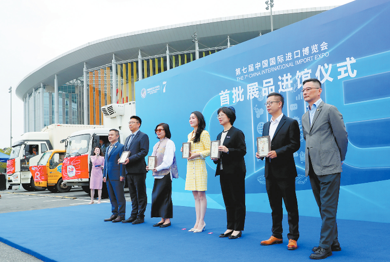 10月22日,首批进馆展品的参展企业代表在进馆仪式上亮相。当日,第七届中国国际进口博览会首批展品进馆仪式在国家会展中心(上海)举行。来自食品展区、医疗器械及医药保健展区和汽车展区的五家展商的展品首批进馆,第七届进博会展区搭建布置工作全面展开,布展工作有序推进。 新华社记者 方喆 摄