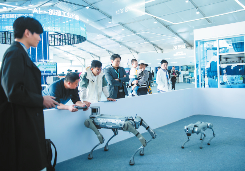 10月24日,观众在第七届世界声博会上参观四足机器人。当日,第七届世界声博会暨2024科大讯飞全球1024开发者节在合肥开幕。本届声博会为期4天,同期举办人工智能产品创新展,前沿人工智能技术与产品亮相展会,吸引不少观众到场参观体验,了解人工智能在工业、教育、休闲娱乐等领域的应用。新华社记者 傅天 摄
