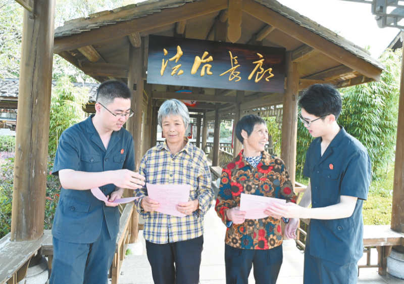 为提高老年群体的法律意识和自我保护意识,近日,上杭县人民法院组织青年干警,前往该县南阳镇敬老院开展普法宣传活动。图为青年干警向老人宣传反诈知识。通讯员 陈立烽 郭媚 摄