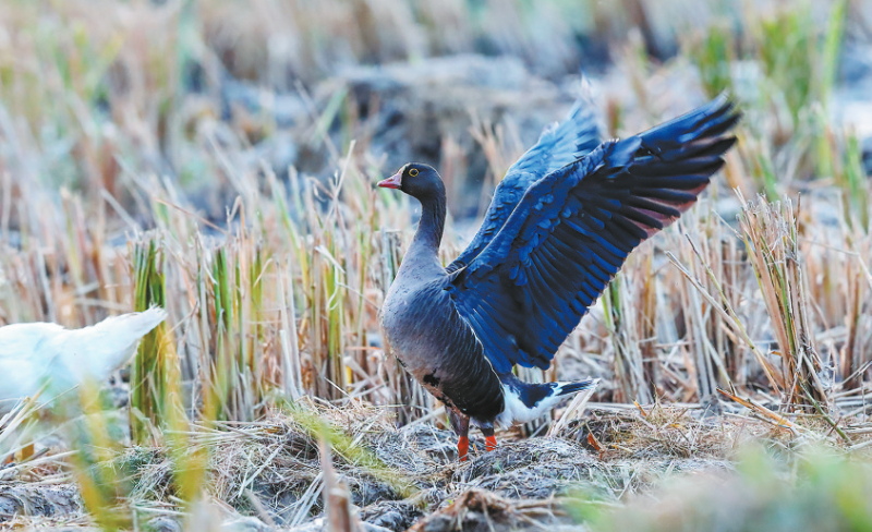10月14日傍晚,长汀县林业局退休干部刘辉在河田镇河田塅观鸟亭观鸟时,遇见一赶鸭人赶了一群白鸭路过,只见成百上千只鸭子排成一队宽宽长长的之字形鸭队,鸭子“嘎嘎嘎”地叫着,有的鸭掉了队,干脆钻到稻田里吃了起来。赶鸭人挥舞着长长的竹竿大声吆喝,吆喝声中惊起的稻田里一只大鸟,“好像是大雁!”刘辉有些兴奋,他赶紧把镜头对准大鸟,聚焦、不停地按快门,“咔嚓、咔嚓......”快门响个不停,闯入他视野的大鸟的各种姿态被定格下来。经专家辨认,这只自带金色眼圈的鸟是小白额雁,是长汀首次影像记录到国家二级保护动物小白额雁,至此,长汀县鸟类种数增加到320种。