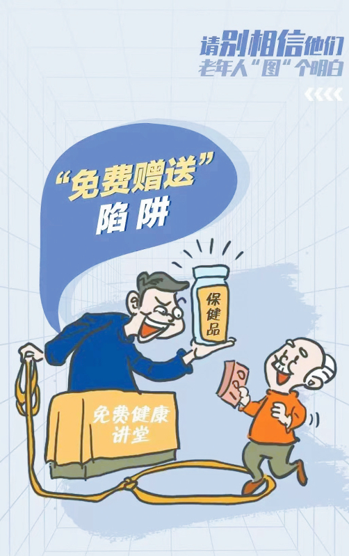 温馨提醒:不法分子通过“免费旅游”的幌子,对老年朋友采取反复听讲座、找托现身说教等方式,引诱他们购买保健食品、医疗器械,宣称保健药物具有抗癌、保命、提高免疫力等效果,结果延误病情。