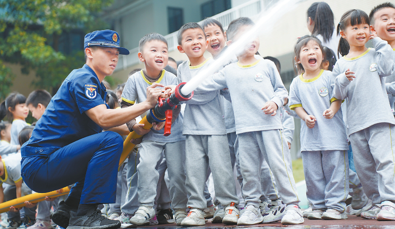 5日,在福建省龙岩市新罗区西陂街道一家幼儿园,小朋友在消防员的指导下体验消防水枪射水。在全国消防日来临之际,各地举行丰富多彩的消防宣传教育活动,帮助人们学习消防知识,提升安全意识。新华社发周杨东 摄