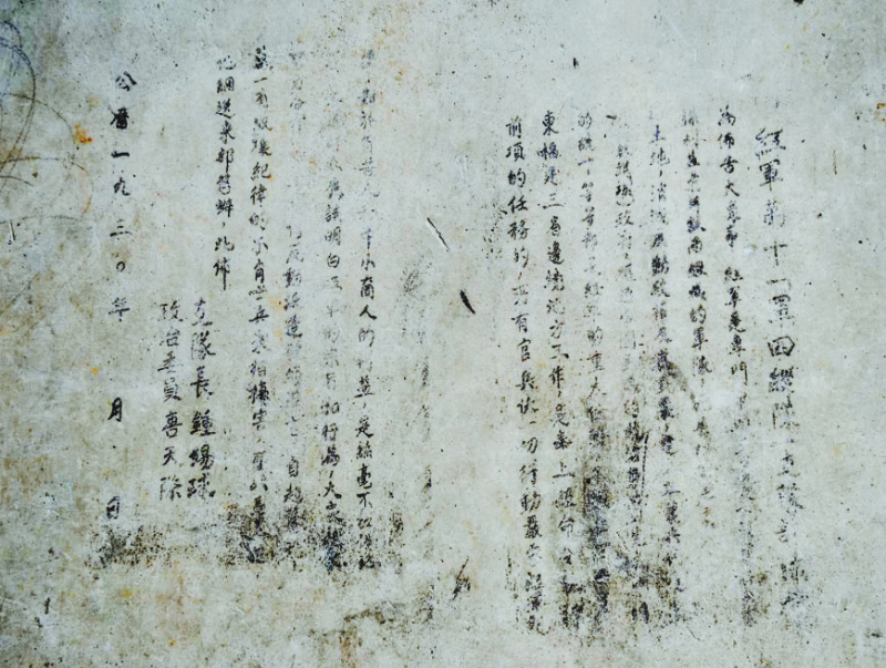 近日,武平县党史工作者前往土地革命战争时期的中央苏区“东南前哨”——武平县永平镇开展调研时,在田背村一幢廖姓古民居墙上赫然发现由毛笔书写的落款为“钟锡球、唐天际”的红11军第4纵队第1支队安民告示,告示主要内容为红军的宗旨、任务和红军纪律,告示明确规定,当地群众如有发现红军官兵违反纪律侵犯群众利益,可当场扭送部队驻地,定当严惩不贷。告示内容充分显示了红军是解救工农群众于苦难,为工农利益而来的一支纪律严明的部队。