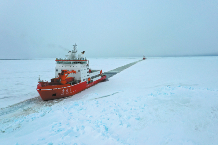 北京时间11月29日,执行中国第41次南极考察任务的“雪龙兄弟”对南极中山站外围陆缘冰进行破冰作业。“雪龙2”号在前负责破冰引航,“雪龙”号依循航迹前进。到达预定停船位置后,“雪龙兄弟”将开展中山站区域卸货作业。这是“雪龙兄弟”在进行破冰作业(无人机照片)。