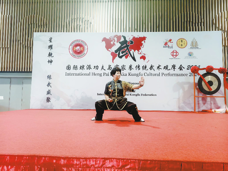 图为丘金莲在观摩会上表演五枚拳组合拳。