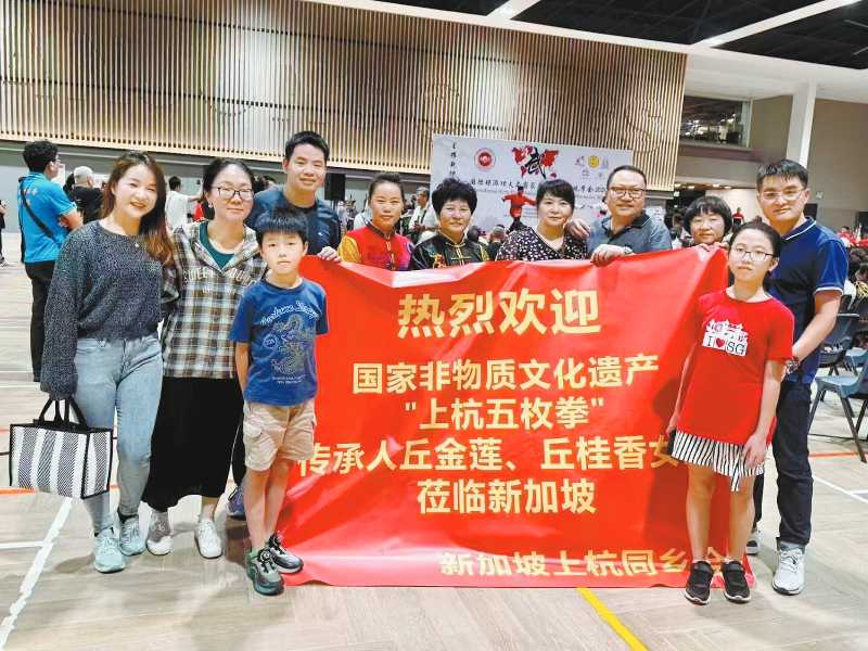 11月1日,新加坡举办国际琼派武术和客家传统武术观摩会。6月29日,作为主办方之一的崇正客家拳社,向上杭县五枚拳协会会长丘桂香、副会长丘金莲发来邀请函。11月2日下午直至晚上,国际琼派功夫与客家拳传统武术观摩会的武术展示,如期在新加坡的芽笼士乃民众俱乐部举行。