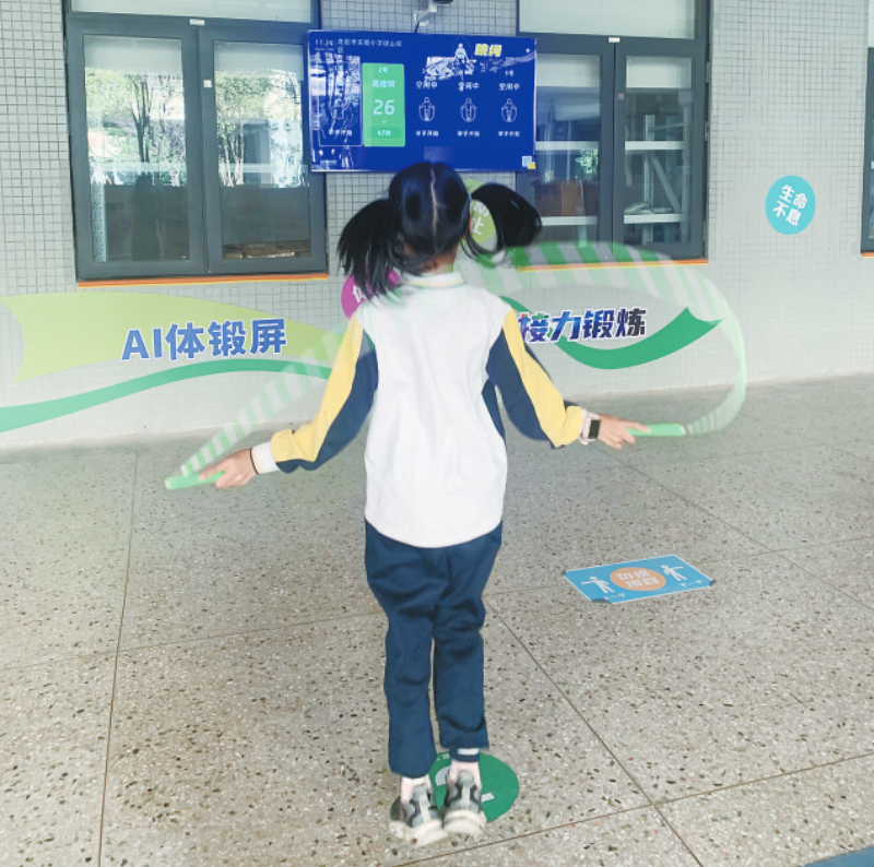 体能训练、球类运动、趣味运动、AI跟我练、体育百科、排行榜......立式趣味锻炼屏内置不同模块,AI智能体能机的引进还为该校体育教学创设了新场景、新生态。教师可以通过姿态对比教学,对学生的运动过程实时打分,纠正错误动作;此外还能提供各项体测项目提分技巧,并将体育、健康、安全等知识形成题库,为学校体育教学构建“健康知识、基本运动技能、专项运动技能”为一体的教学模式。在11月中旬举办的校运会中,学校启用AI自动计数跳绳和自动跳远测量等高科技的体验,全面助力体育教学提质升级,让学生爱上运动。