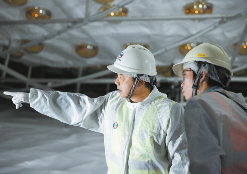 12月16日,江门中微子实验项目经理王贻芳院士(左)在池底检查施工进展。新华社记者 金立旺 摄