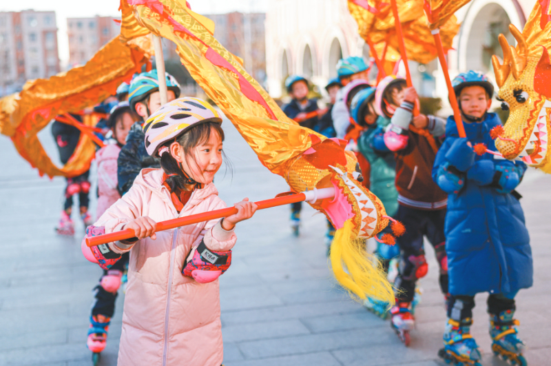 12月26日,在山东省荣成市实验小学校园内,孩子们练习轮滑舞龙,为迎新年文艺汇演做准备。元旦将至,各地中小学校和幼儿园组织多彩活动,欢乐喜庆迎接新年。 新华社发 李信君 摄