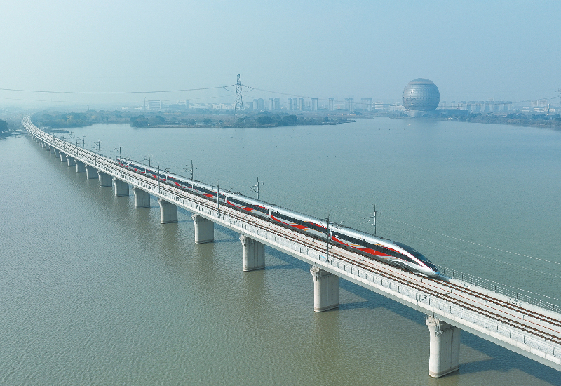 12月26日,列车行驶经过湖州南浔站附近(无人机照片)。当日,上海经苏州至湖州高铁(沪苏湖高铁)开通运营,上海虹桥至湖州站最快55分钟可达。沪苏湖高铁自上海市上海虹桥站引出,途经江苏省苏州市,接入浙江省湖州市湖州站,线路全长164公里,设计时速350公里。 新华社记者 黄宗治 摄