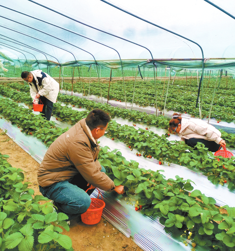 虽是寒冬时节,种植大棚内却是草莓飘香。眼下,长汀县新桥镇各草莓种植基地的草莓陆续成熟,吸引了不少游客前来采摘、品尝,乐享“莓”好时光。图为在长汀县新桥镇乡村振兴示范片区的草莓种植基地温室大棚内,游客正在采摘草莓。 通讯员 黎寿钦 摄