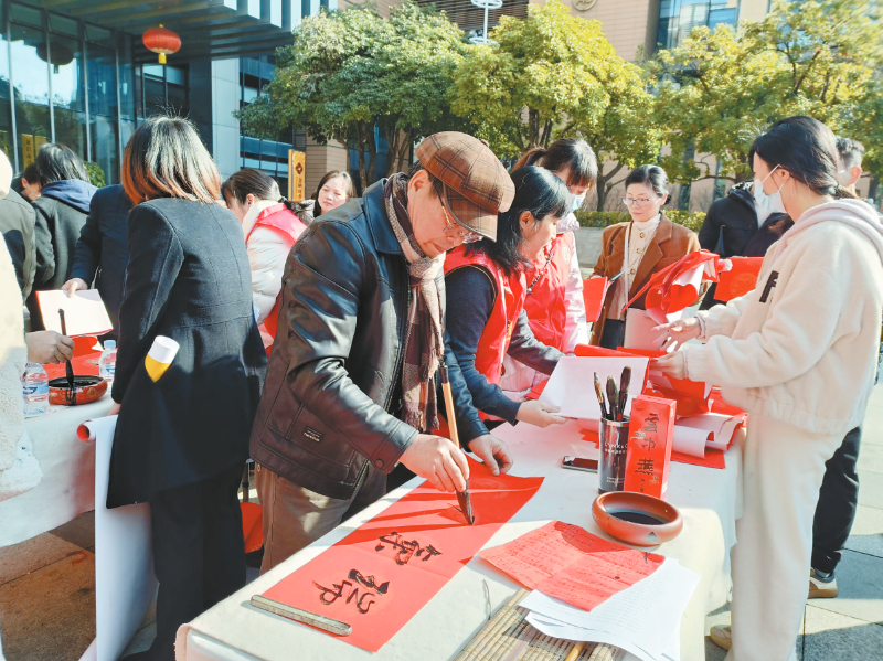前来领取春联的市民曹林拿着刚写好的春联笑得合不拢嘴:“很高兴拿到书法家亲手写的对联,这手写的春联比买的更有年味,感觉年更近啦!”在年轻工作人员建议下,书法家们还为年轻人定制了“哈哈哈哈”“旺旺旺旺”创意对联及“八方来财”“钱马上来”等创意“福”字,为活动增添了不少趣味。