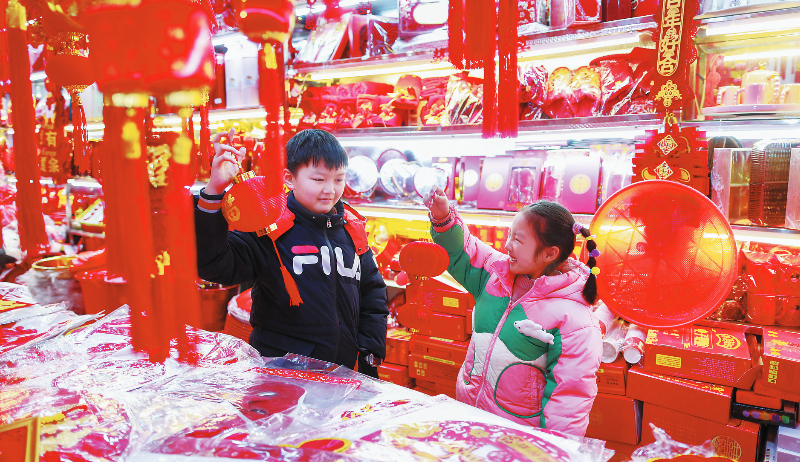 1月24日,小朋友在江苏省兴化市楚水招商城选购新年饰品。