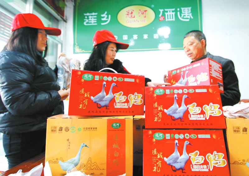 随着春节临近,位于连城县城区步行街的连城白鸭专卖店迎来了销售旺季,据店主介绍,最近线上线下购买连城白鸭速冻保鲜鸭品的很多,高峰期日销量逾2000只。图为近日消费者在店里选购。 通讯员 邹善水 沈桂芬 摄