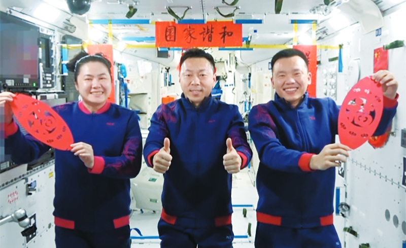 春节前夕,神舟十九号航天员乘组在中国空间站向全国人民拜年(视频截图)。 新华社 发